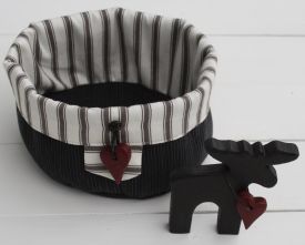 Särskilt omtyckta är mina brödkorgar i rips med ett innerfoder av halvlinne med invävda älgar. Av liknande tyger syr jag också kuddar med fyllning.
