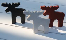 Vissa produkter, som de träälgar jag har formgivit, arbetar min man och jag med tillsammans. Han slipar ytorna på formerna som sågas ut i svenskt furuträ. Jag bearbetar konturerna och står för den sista finishen. En del av älgarna lämnar jag i naturträ, andra målar jag med en egen färgblandning i svart eller vitt. Som avslutning behandlas alla med ekologiskt bivax och får ett trä-hjärta eller ett vävt band som dekoration.