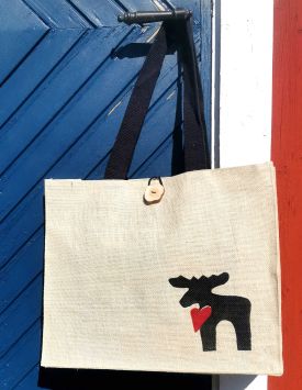 Tanken på hållbarhet har fått mig att börja erbjuda jutepåsar med tryckt eller påsydd älg. De är rymliga och stabila, har en liten innerficka och långa handtag. De stängs med en handgjord träknapp eller ett trähjärta.